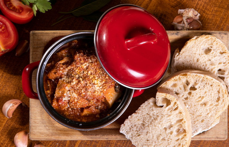 Un piatto antico e gustoso della tradizione emiliana. Trippa bovina insaporita con pancetta, prosciutto, Parmigiano Reggiano e aromi.